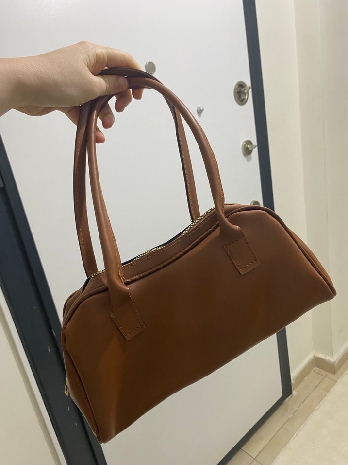 Minimalist tarzda, parlak yüzeyli bej deri kadın el çantası, tokalı detaylarla günlük sokak modasına uygundur.
