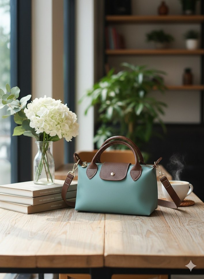 Pastel bej deri ve kahverengi saplı, tokalı kapaklı minimalist tasarımlı çağdaş kadın el çantası. Günlük kullanım için uygundur.