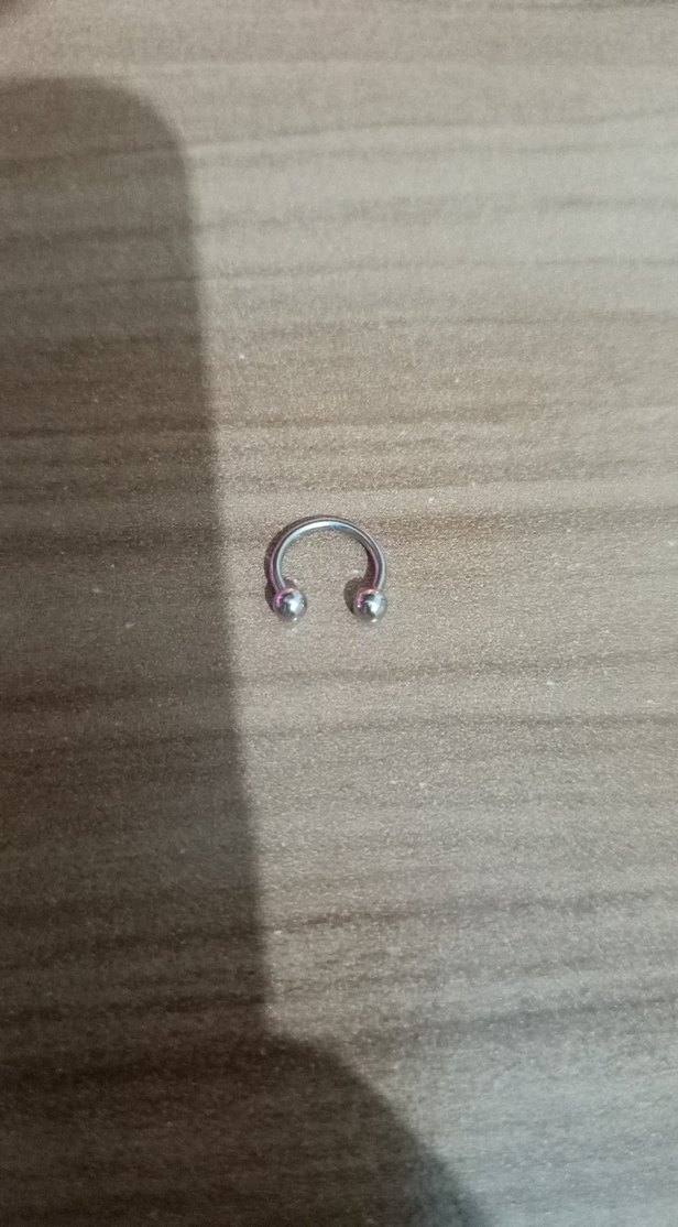 Bej ve gri tonlarında, tokalı minimalist kadın piercing. Sade ve temel tarzlar için uygundur.