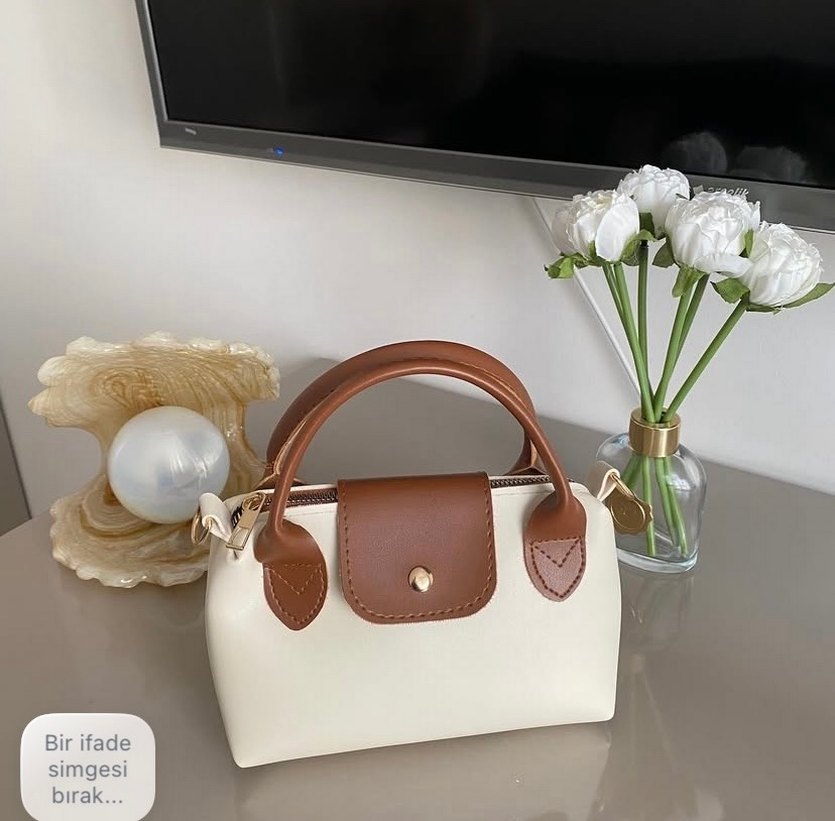 Minimalist beyaz deri kadın çanta, kahverengi sapları ve baskılı desenle modern klasik tarzda. Günlük kullanıma uygun, zarif bir görünüm sunar.