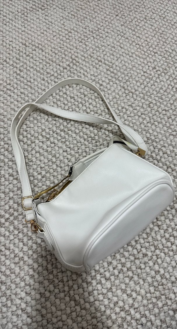 Minimalist beyaz deri kadın çanta, fermuarlı kapanışa sahip, modern klasik tarzda, günlük kullanım için uygun. Desensiz tasarımı klasik zarafet katıyor.