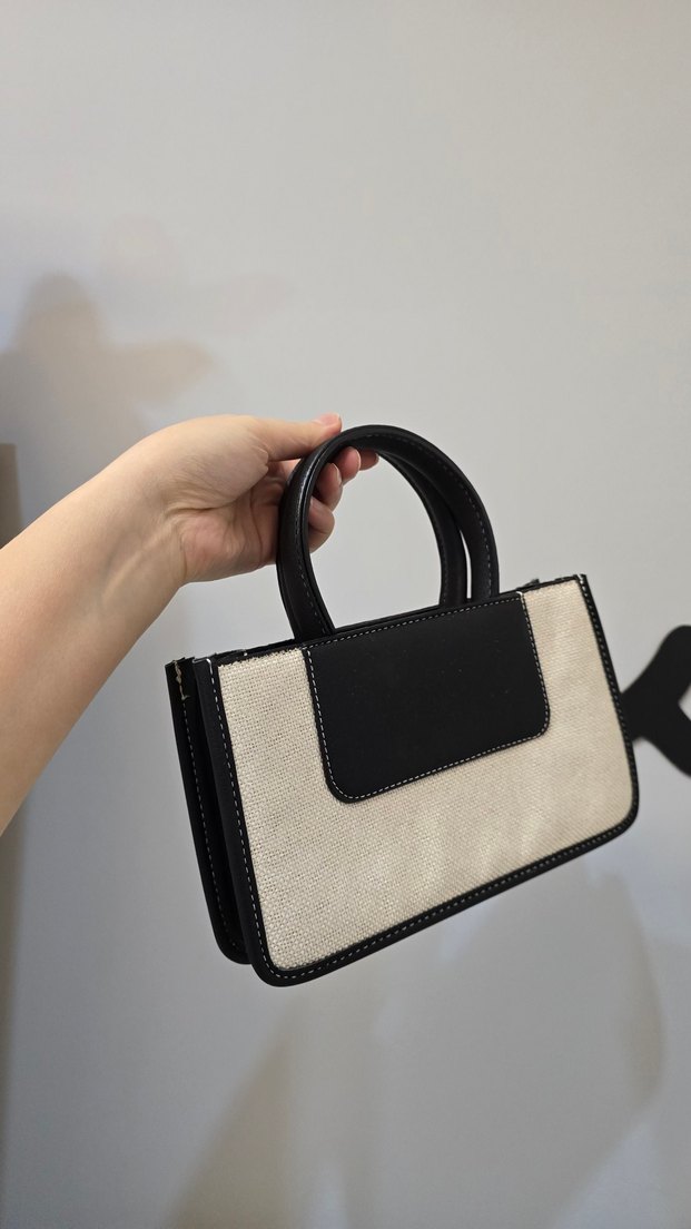 Minimalist beyaz deri ve gri detaylı, desen içermeyen kadın çantası, şık ve gündelik tarz için uygundur. askısı yoktur