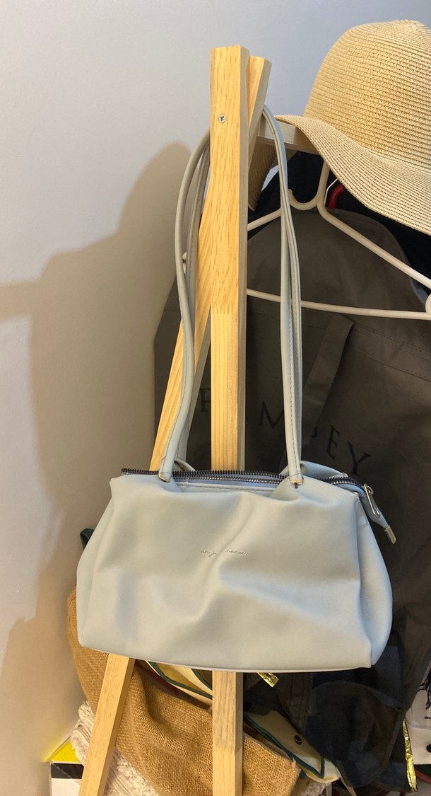 Minimalist beyaz deri kadın çanta, fermuarlı kapanış ve uzun askılarla günlük rahat sokak stiline uygundur.