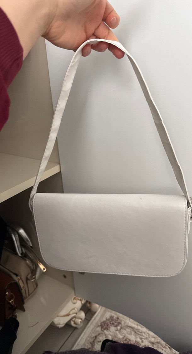 Minimalist tasarımlı beyaz deri kadın çantası, tokalı askısıyla sade ve şık. Günlük sokak stili için uygundur.