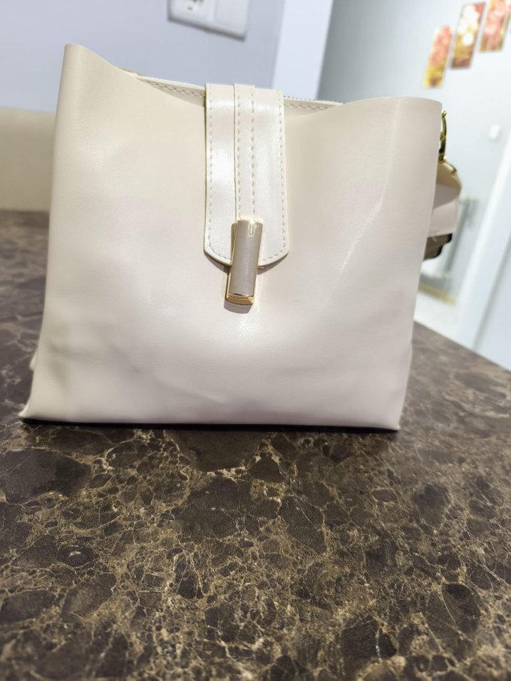 Minimalist beyaz deri kadın çanta, tokalı kapama ve desensiz yüzeyiyle günlük kullanım için uygundur.