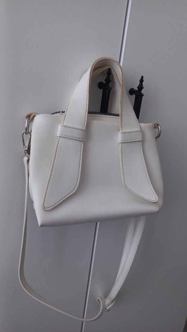 Minimalist beyaz deri kadın çanta, tokalı detaylı, desen içermeyen sade tasarımıyla günlük sokak stiline uygundur. Kulplu ve ayarlanabilir askılıdır.