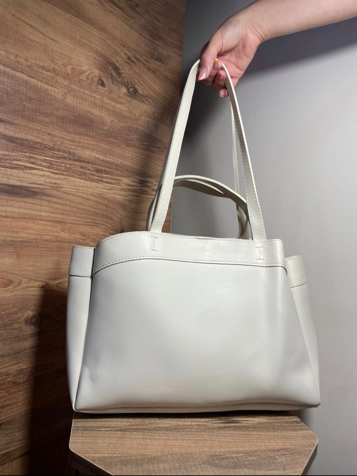 Minimalist beyaz deri çanta, desen içermeyen yüzeyi ve çağdaş tasarımıyla günlük kullanıma uygun sade ve şık bir modeldir.