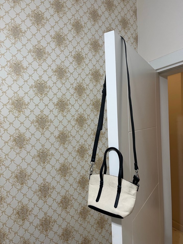 Minimalist beyaz deri çanta, tokalı detaylar ve siyah saplarla. Günlük kullanıma uygun, sokak stili için ideal sade tasarım. İç astarında yırtık var