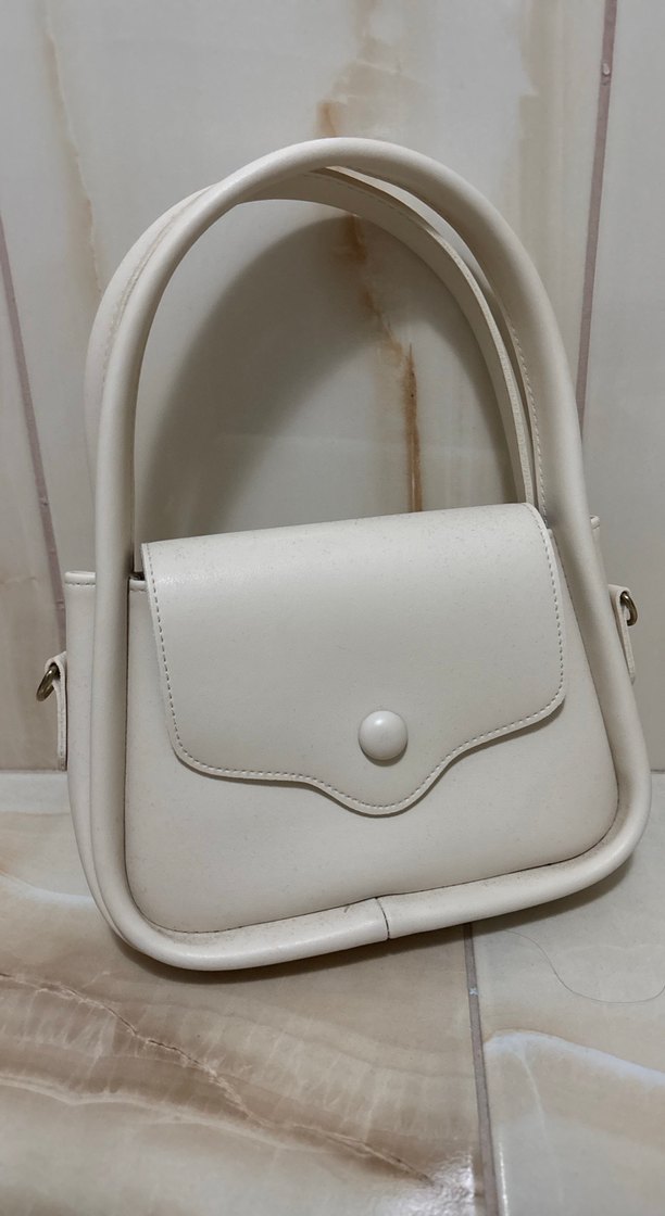 Minimalist beyaz deri kadın çanta, tokalı kapak ve modern klasik tasarıma sahiptir. Düz yüzeyi ve yapılı formu günlük kullanım için uygundur.