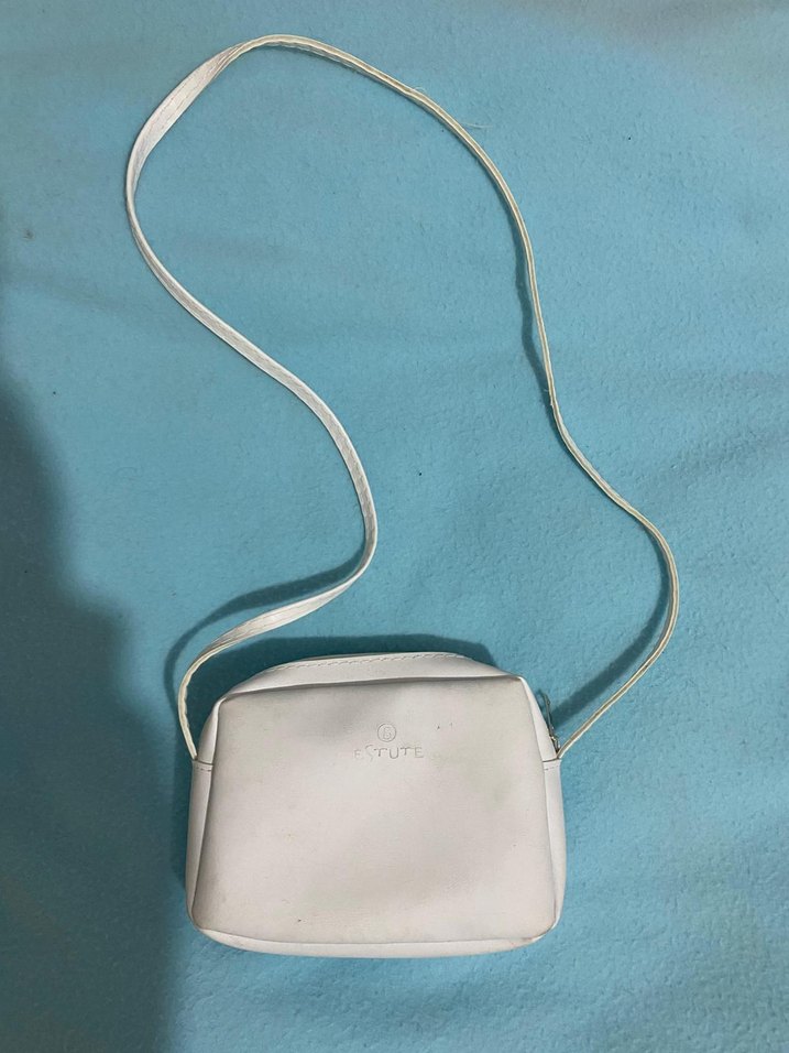 Minimalist beyaz deri çapraz çanta, fermuarlı ve deseniz tasarıma sahip, trend sokak stiline uygun.