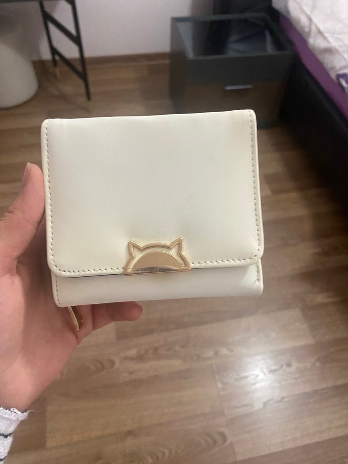 Minimalist beyaz deri kadın cüzdan, tokalı kapama ve sade tasarıma sahip. Günlük kullanıma uygun, düz yüzey ve önünde küçük kedi figürü var.