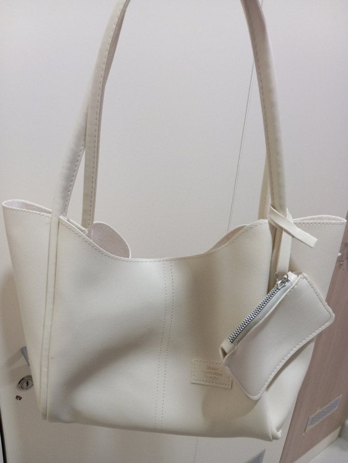 Minimalist tasarımlı beyaz deri omuz çantası, fermuarlı küçük cüzdanla birlikte günlük ve sokak stiline uygun. Birkaç mavi mürekkep lekesi var onun dışında hiç kullanılmadı