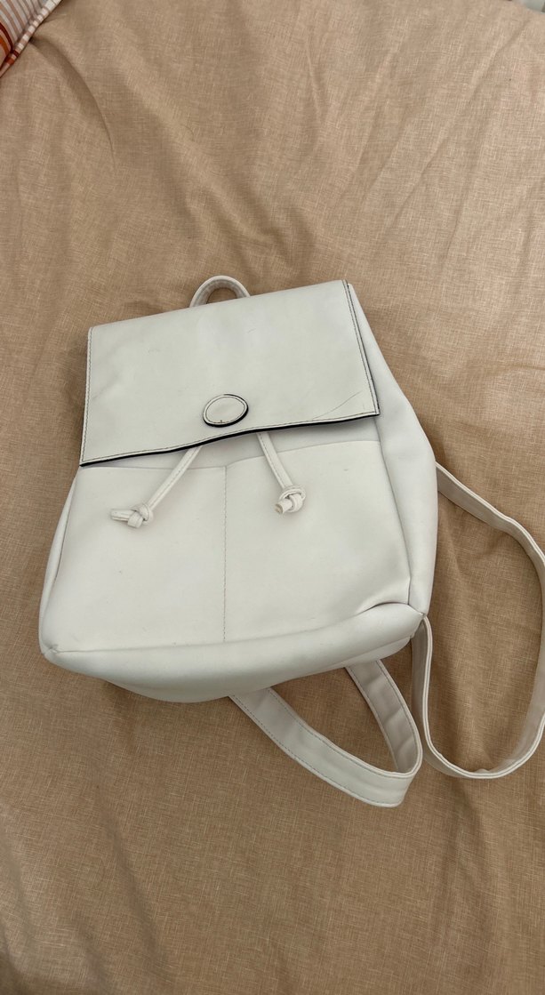 Beyaz deri sırt çantası, tokalı kapak ve sade desensiz tasarıma sahiptir. Minimalist ve düz stiliyle günlük sokak modasına uygundur. kot pantolonu rengini verdi arka çantanın arkasına.