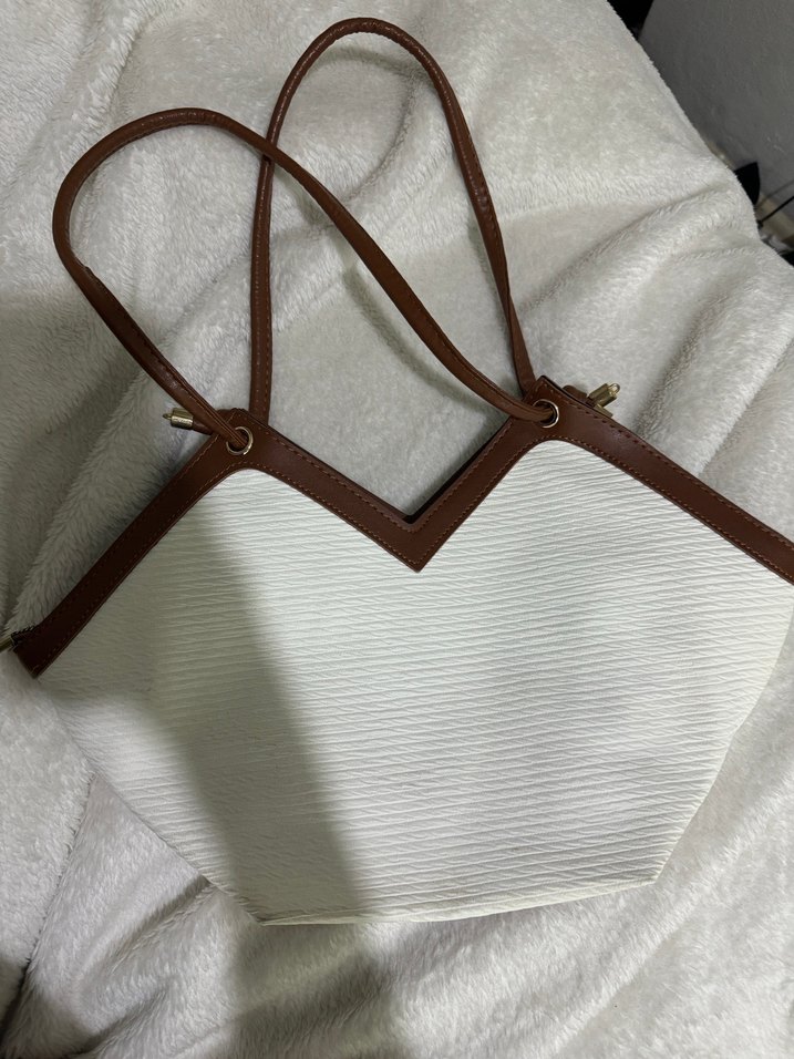 Minimalist tasarımlı, beyaz pliseli deri çanta, kahverengi detaylı çift saplı, günlük kullanım ve sokak modasına uygun. Mağaza ürünüdür 0