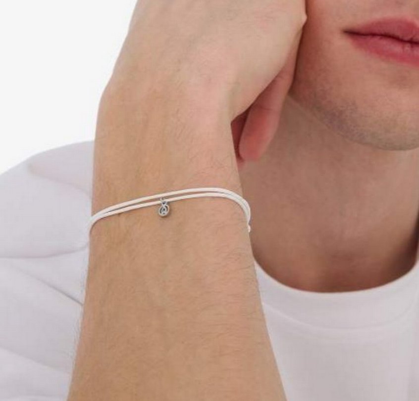 Minimalist beyaz erkek bileklik, ince çift bant ve küçük bir aksesuar ile trendy günlük sokak stili için uygundur. ✨