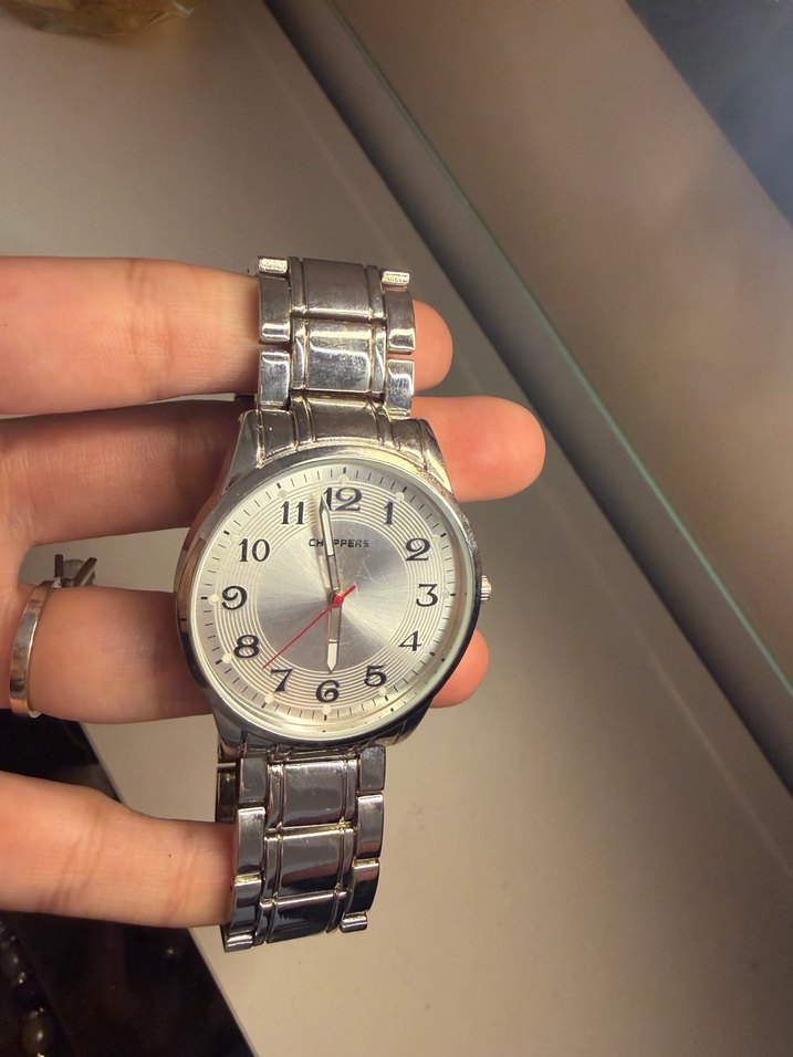 Minimalist tasarımlı beyaz kadranlı erkek kol saati, siyah rakamlarla ve gümüş metal kayışla sade bir görünüm sunar. ⌚