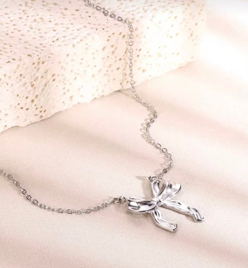 Günlük kullanıma uygun, beyaz pastel fiyonk detaylı minimalist kolye, çağdaş tarzda gümüş zincirle tamamlanmıştır.