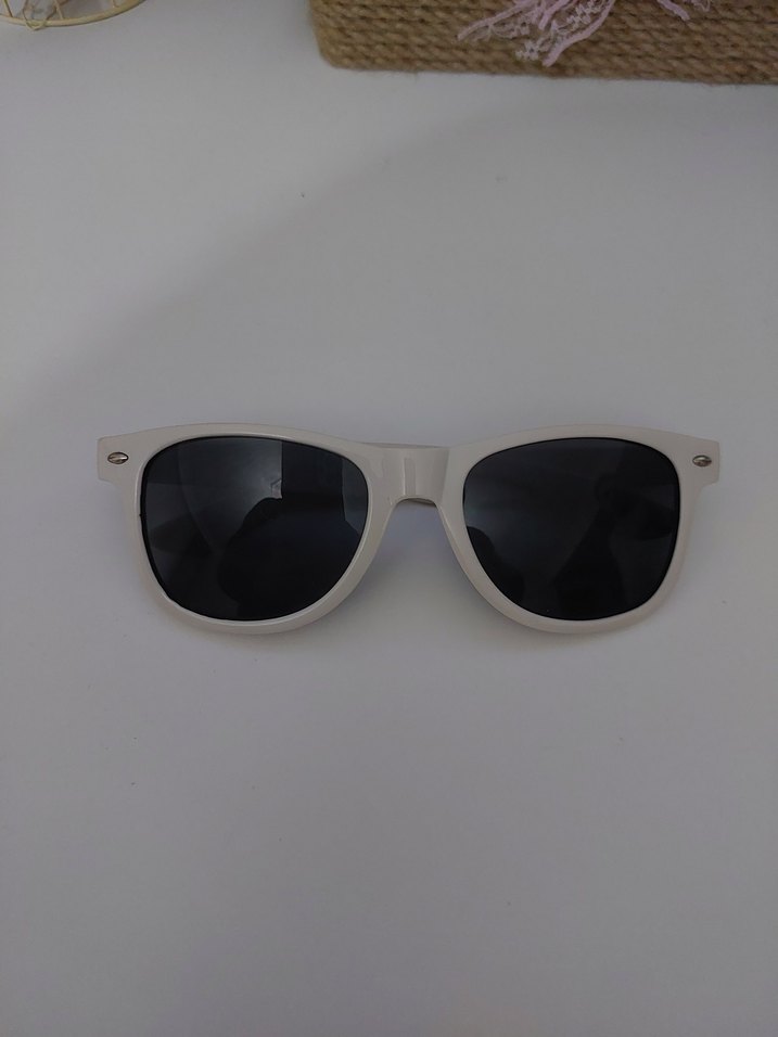 Minimalist beyaz transparan çerçeveli, koyu renk camlı güneş gözlüğü, sade ve karşı kültür tarzını yansıtıyor. ️