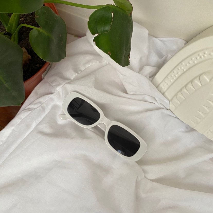 Minimalist dikdörtgen beyaz çerçeveli kadın güneş gözlüğü, sokak stiline uyumlu ve zahmetsiz şıklık sunar. Temel, sade görünüm için ideal.