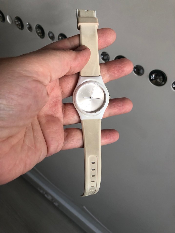 Beyaz ve gri renklerde minimalist tasarıma sahip, tokalı kayışlı sade ve temel kadın kol saati.⌚
