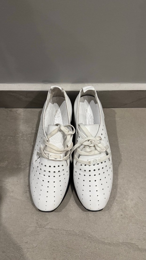 Minimalist beyaz stiletto topuklu kadın spor ayakkabı, delikli tasarımı ve kauçuk malzemesi ile günlük kullanım için uygundur. Zahmetsiz şıklık sunar.
