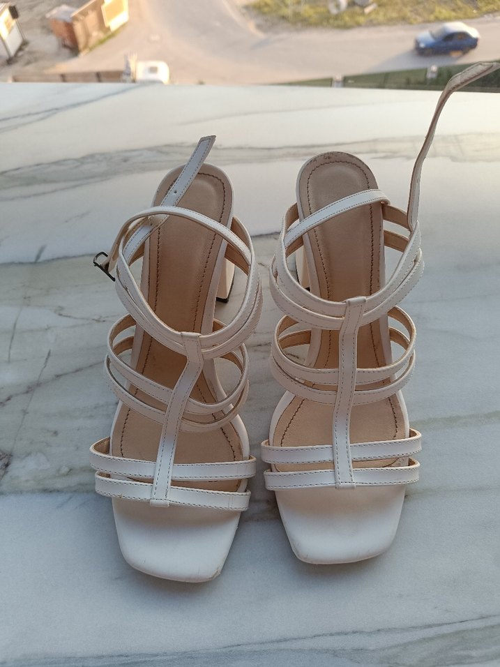 Beyaz, topuklu ve tokalı kadın sandaletleri. Yumuşak kauçuk malzemeden üretilmiş, çoklu bantlı ve kare burunlu modern tasarım, günlük kullanım için uygundur.