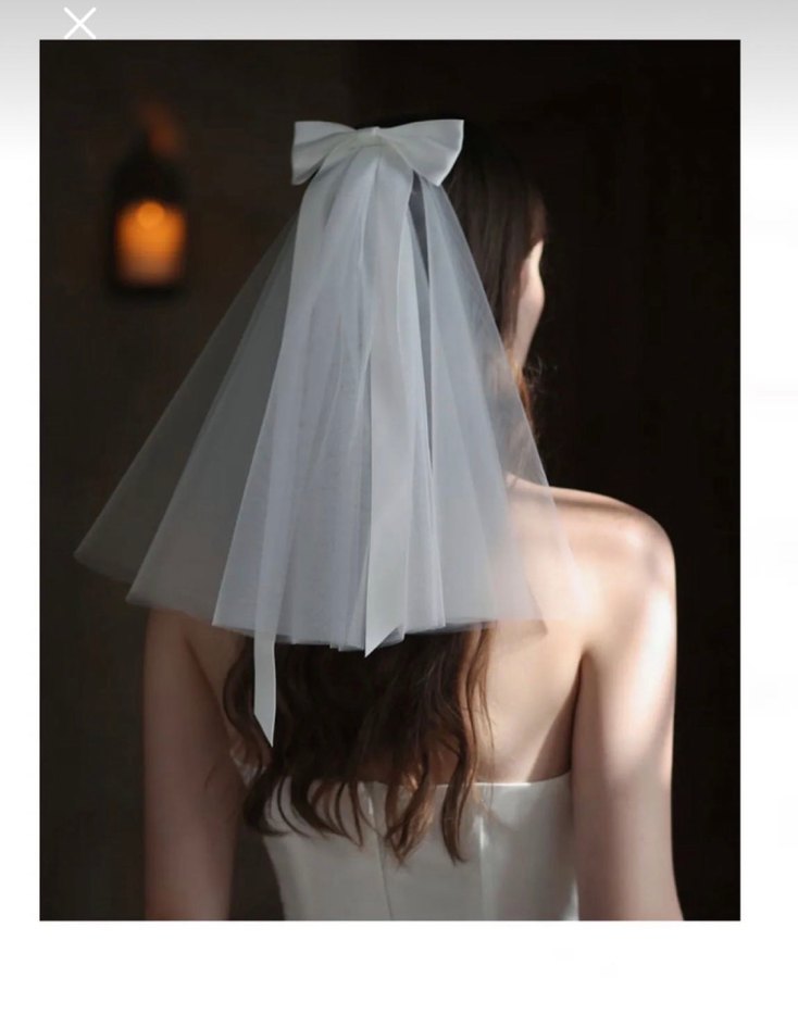 Beyaz gelin duvağı, drapeli tasarımı ve fiyonk detayıyla minimalist ve klasik şıklığı bir araya getiriyor.
