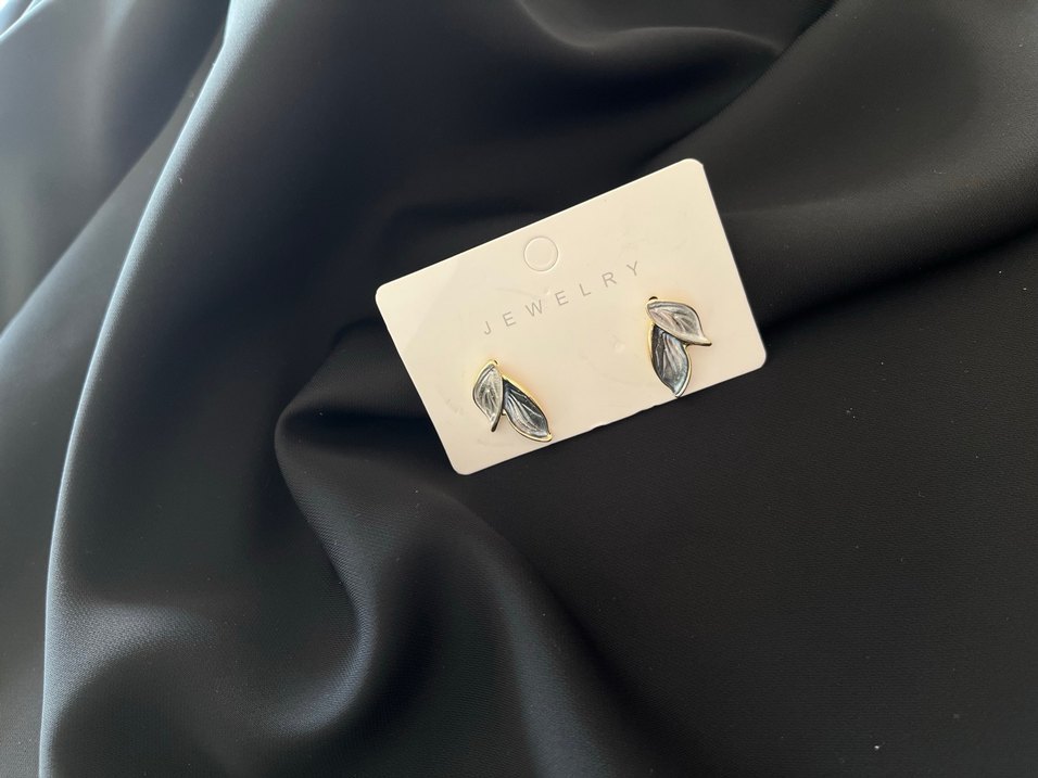 Günlük kullanıma uygun, parlak beyaz ve gri baskılı yaprak desenli minimalist mini küpe.