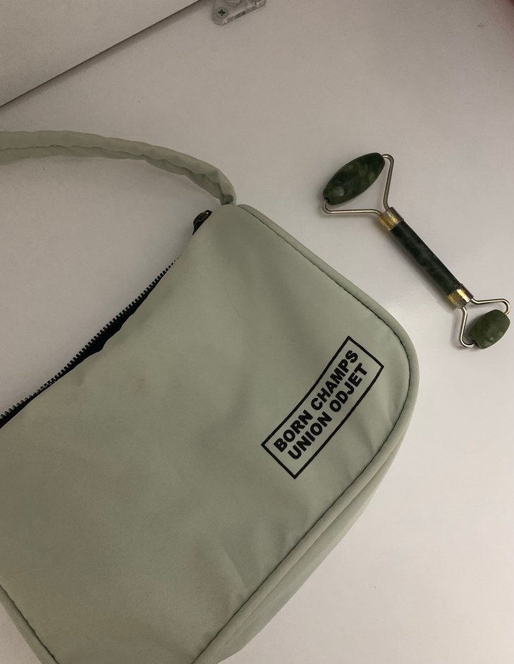 Düz sentetik kumaştan yapılmış, "BORN CHAMPS UNION OBJET" yazılı baskılı gri kadın çanta. YANINDAKİ GUA SHA ROLL ON HEDİYEDİR VE ORJİNALDİR sadece bir defa kullanıldı yeni gibi defosuz