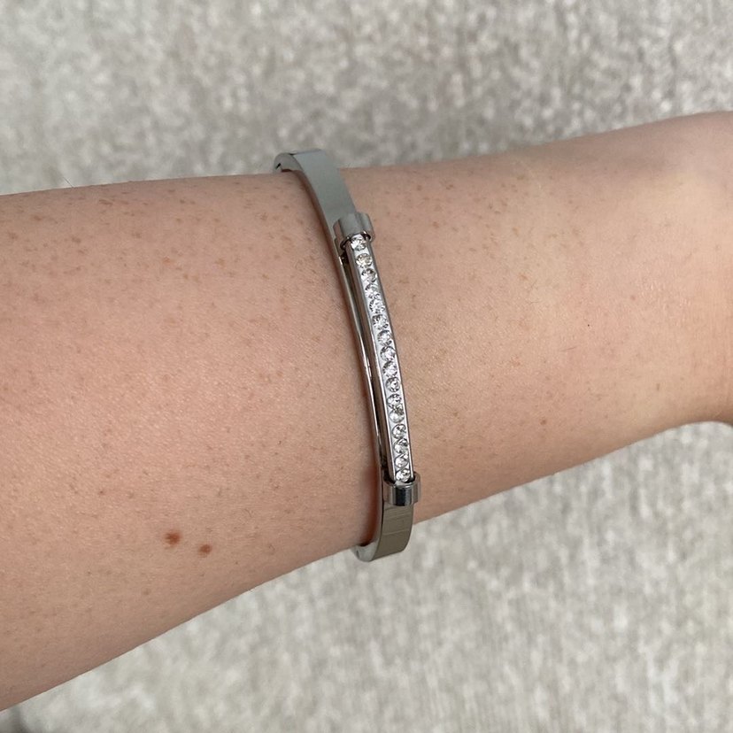 Gri renkte tokalı kadın bileklik, üzerinde parlak taşlar bulunan minimalist ve çağdaş tasarım, romantik akşamlar için şık bir seçimdir.