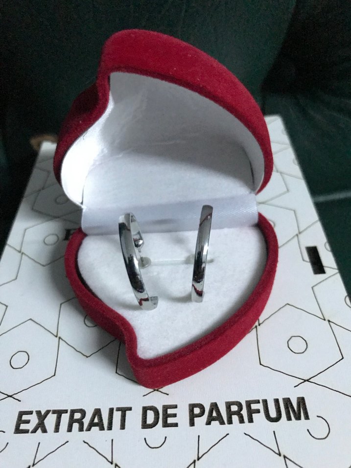 Kırmızı kadife kalp kutusunda minimalist küpe. Ambalajda "Klasik şıklık için uygun.