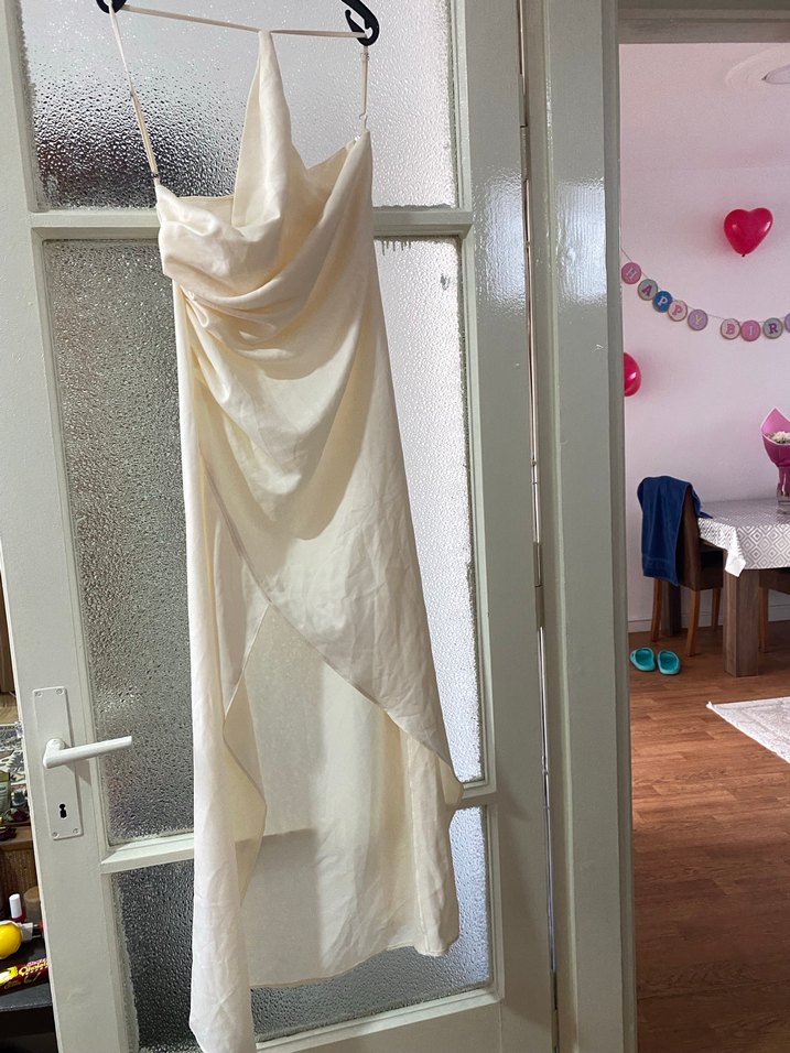 Kırık Beyaz renkte, ince askılı ve straplez yakalı, vücuda oturan uzun uzunlukta minimalist tarzda gelinlik. Yumuşak dokulu kumaşıyla şık duruş sağlar. Bir sorunu yoktur.Ütülenince yeni gibi olur.Son fiyattır