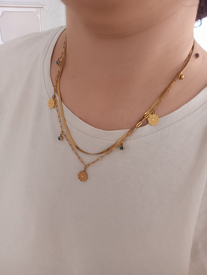 Minimalist tarzda, küçük yuvarlak figürler ve renkli detaylar içeren katmanlı altın tonlu kolyeler. ✨