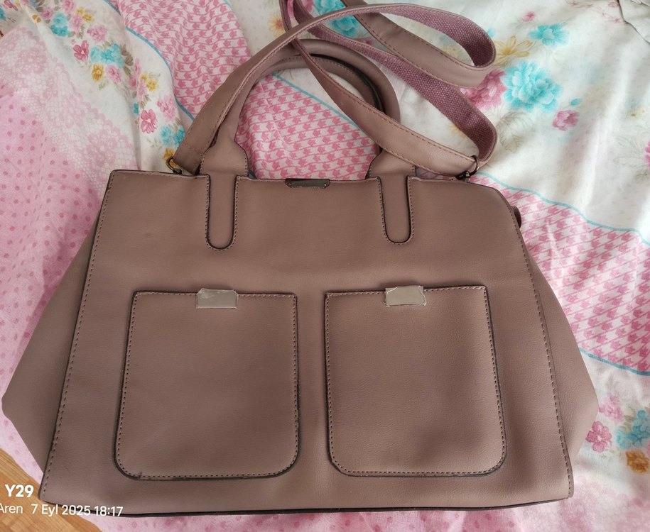 Kahverengi deri, tokalı ve iki ön cepli minimalist kadın çantası, günlük kullanıma uygun. Yenidir kullanmadım