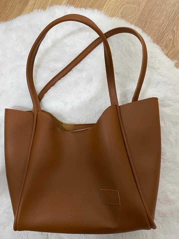 Kahverengi deri kadın çanta, minimalist ve desen içermeyen yüzeye sahip. Uzun saplarıyla günlük kullanıma uygun, trend ve rahat tarzda.
