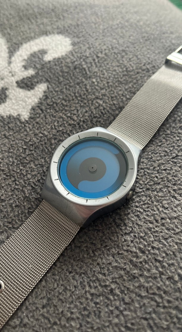 Gri metal file kayış ve mavi-gri kadranlı, çağdaş minimalist tasarımlı erkek kol saati. Modern tarzlara uygun şık görünüm. ⌚