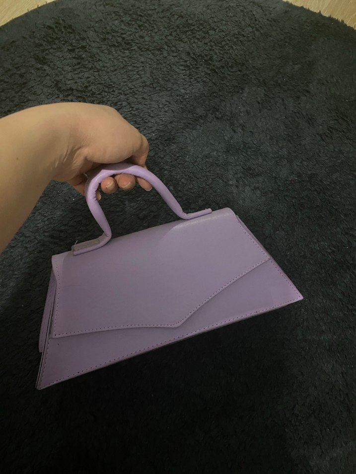 Mor deri, tokalı kadın çanta. Minimalist ve çağdaş tasarıma sahip, günlük kullanıma uygun, düz yüzeyli ve sade saplı.
