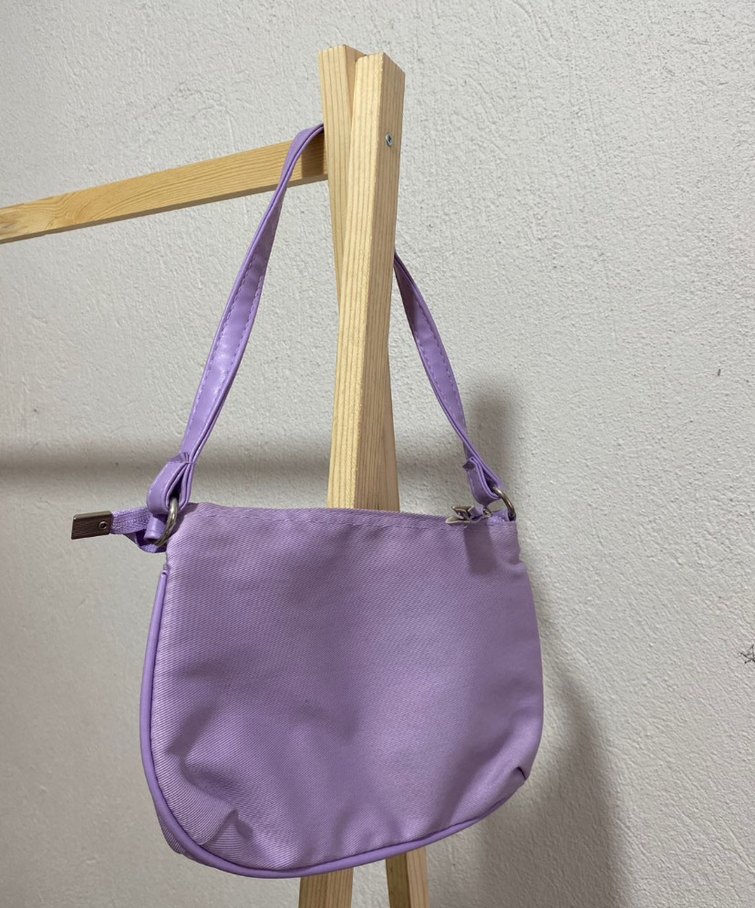 Pastel mor renkte, tokalı askıya sahip sentetik kumaş kadın çantası. Minimalist ve desen içermeyen tasarımı günlük kullanım ve sokak stiline uygundur.