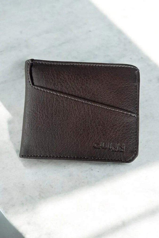 Minimalist, parlak kahverengi erkek cüzdan, desen içermeyen tasarıma sahip ve önünde 'GUINN' logosu bulunur.