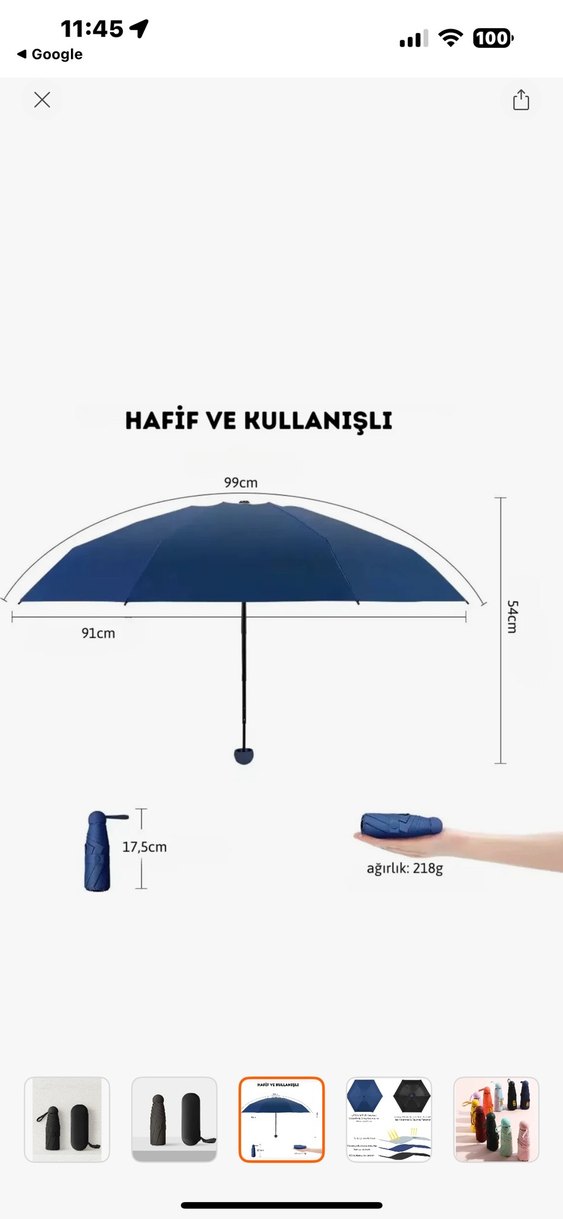Lacivert ve siyah renk mevcut , sade tasarımlı kişemsiye. 99 cm çapında, hafif ve kullanışlıdır. 218 gram ağırlığında, 17,5 cm boyunda katlanabilir. ☂️