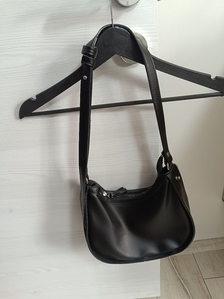 Minimalist tasarımlı siyah deri çanta, tokalı askısıyla günlük kullanıma uygun, az kullanıldı deformesi yok