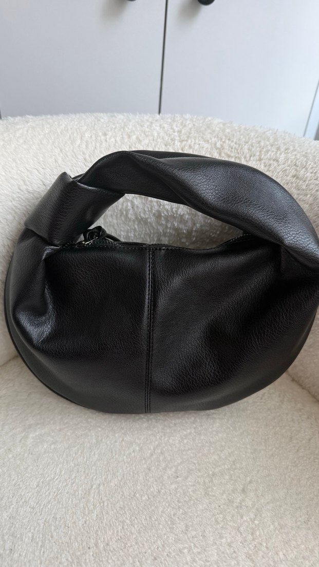 Minimalist siyah deri kadın çantası, tokalı sapıyla çağdaş bir tasarıma sahip. Düz, desensiz yüzeyi günlük kullanıma uygun, sade ve temel stilde.