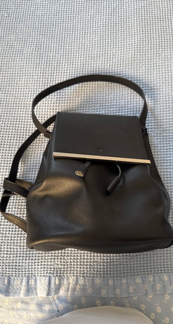 Minimalist siyah deri sırt çantası, tokalı kapak ve pürüzsüz dokuya sahip, günlük kullanım için uygundur.