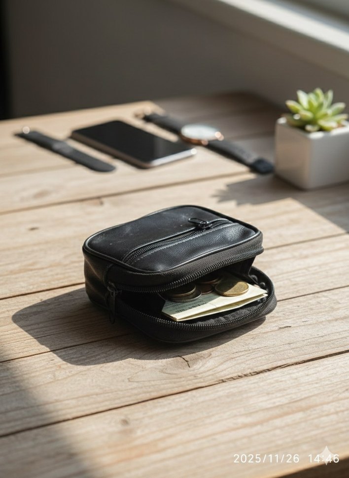 Minimalist siyah erkek cüzdanı, bozuk para ve kağıt para için fermuarlı bölmelere sahip kompakt tasarımıyla dikkat çekiyor. Düz ve koyu renklidir.