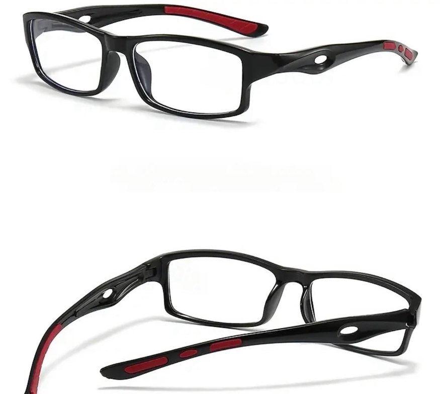 Minimalist siyah erkek gözlüğü, çağdaş dikdörtgen çerçeve ve kollarda ince kırmızı detaylarla sade ve temel bir stile uygun.