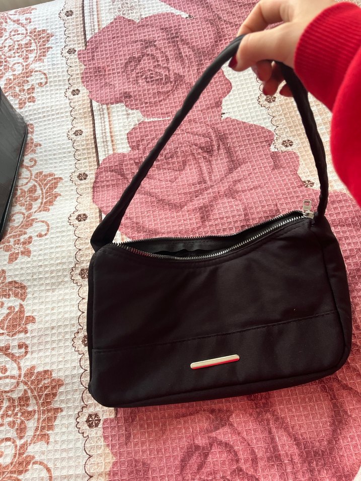 Siyah sentetik kumaştan, fermuarlı, minimalist tarzda kadın çantası. Tek askılı, desen içermeyen sade tasarım, günlük kullanıma uygundur.