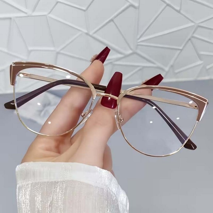 Minimalist ve çağdaş, üst düzey, moda, bal rengi kedi gözü kadın imaj gözlüğü. Klasik ve zarif, ama bir okadar da tarz bir görünüm sunar. Tam çerçeve şeffaf lensler, metal çerçeve.