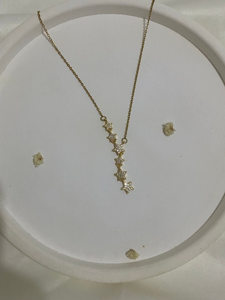 Minimalist tarzda, uzun zincirli ve işlemeli yıldız desenli altın kolye, günlük kullanıma uygundur.