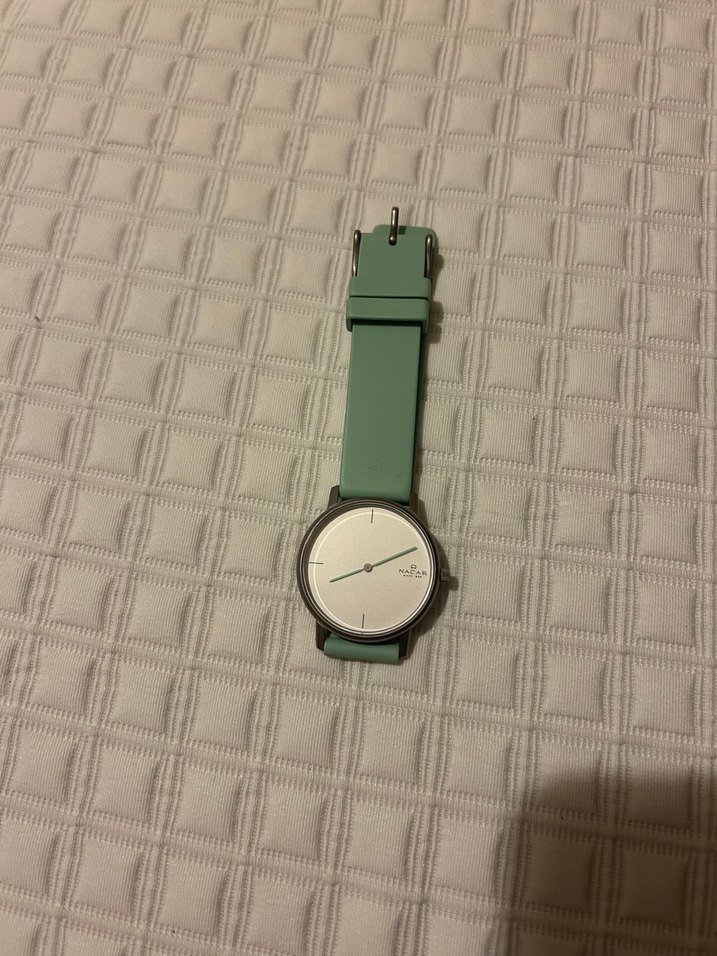 Minimalist tasarıma sahip, yeşil kemerli kayışlı kadın saati. Günlük şıklık için uygun, sade yuvarlak kadranlı. ⌚