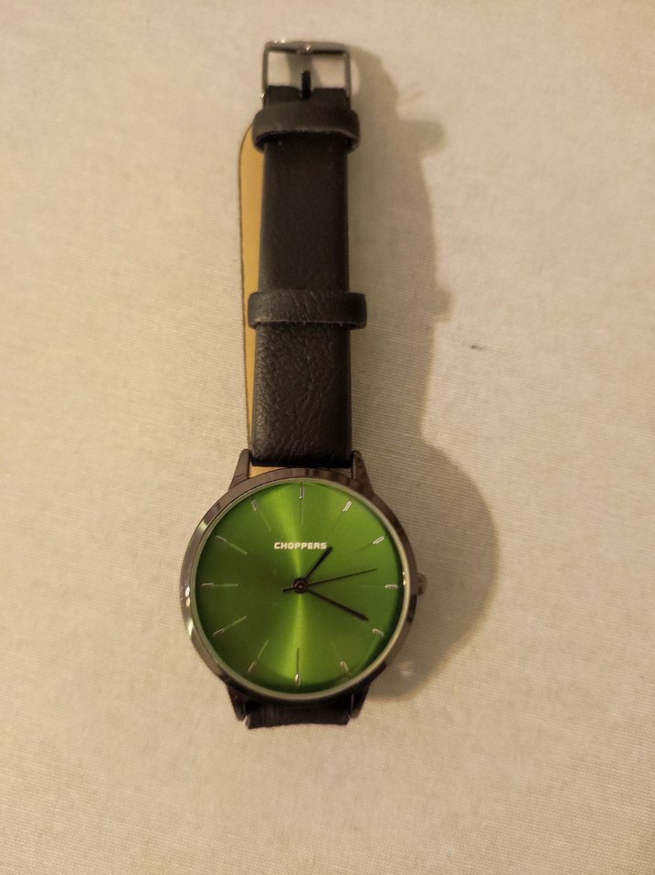 Siyah deri kayışlı, koyu yeşil minimalist kadranlı üniseks kol saati. ⌚